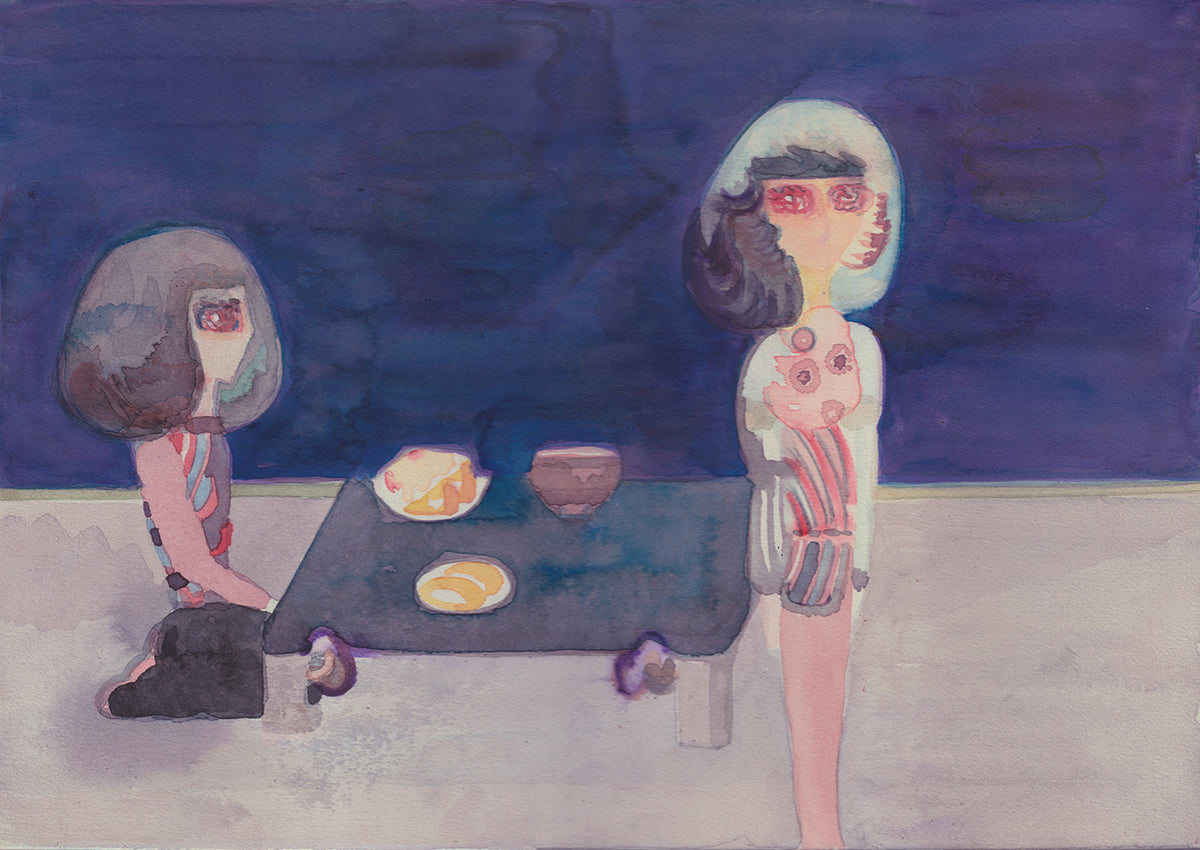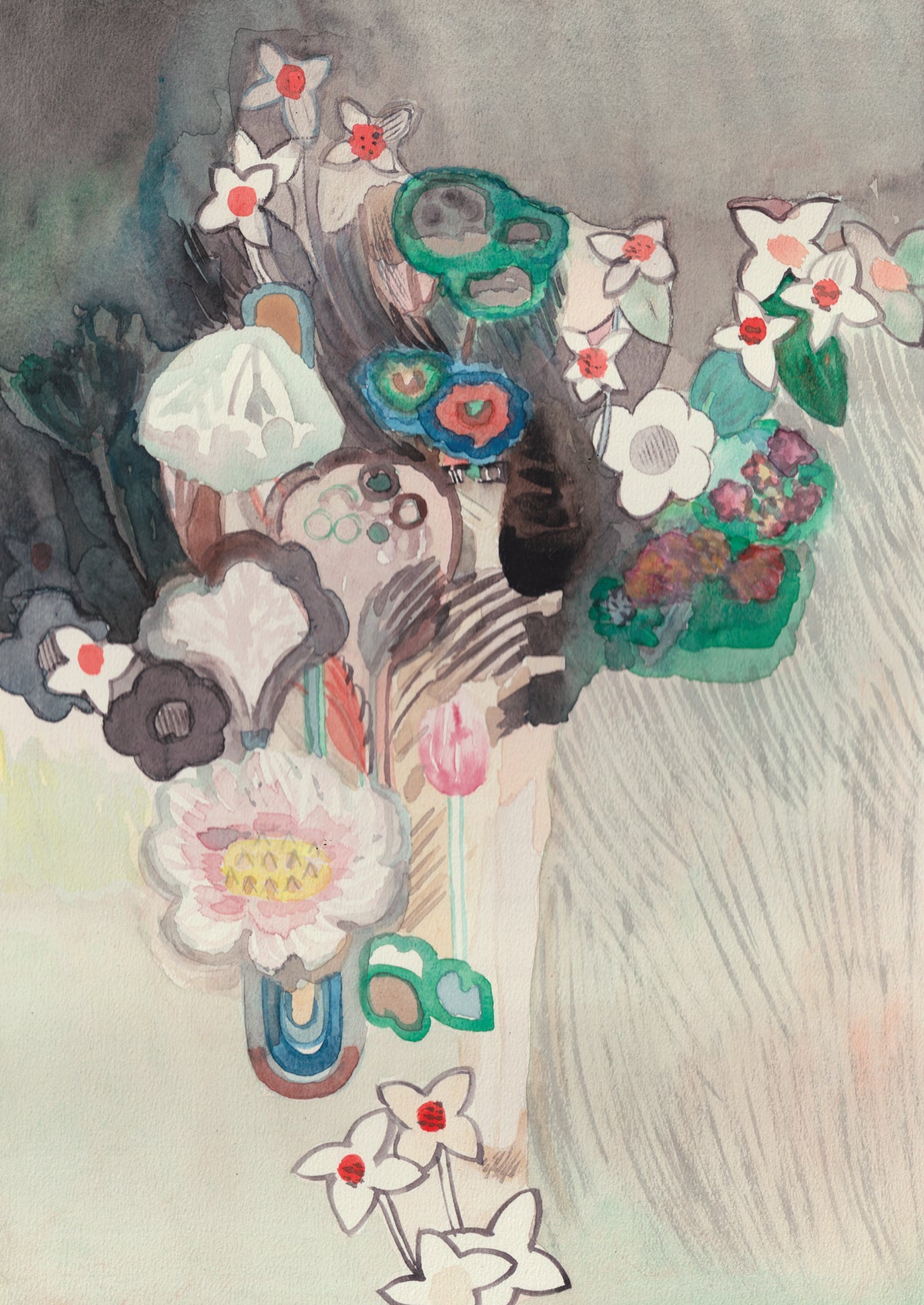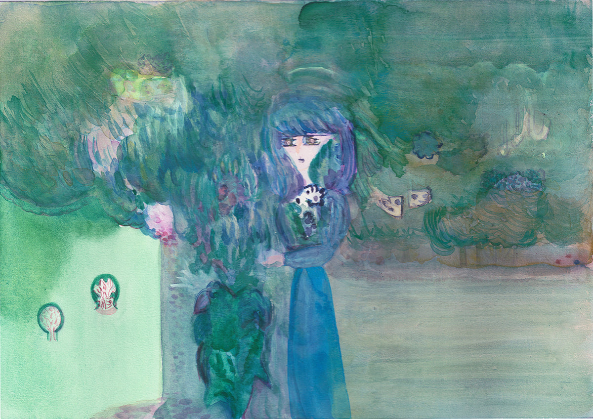 Just like drawing in a picture diary, she has a pristine motivation stemming from childhood to honestly express the emotions that struck her that day, as well as the artistry of layering watercolors, carefully calculated to create beautiful bleeding effects. The combination of these two elements creates an expression in which the abstract spiritual world coexists with the gentle warmth of the real world.